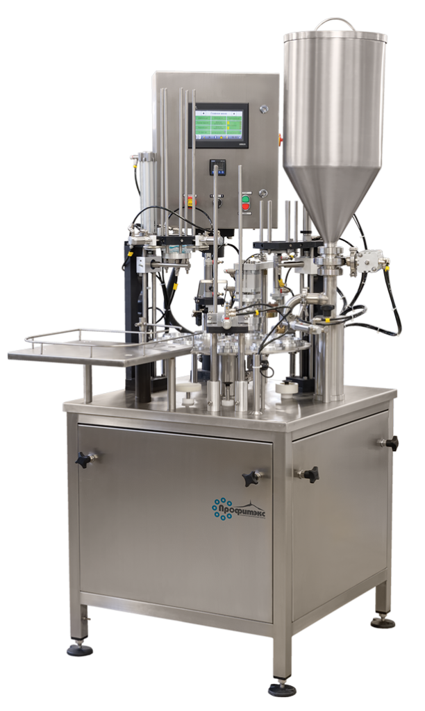 The filling machine is designed for filling liquid and pasty products in plastic cups and containers of various shapes with Alu lids or Alu foil heat sealing and capping with a plastic top.